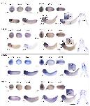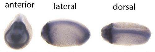 efna4 (ephrin A4) gene expression in X. laevis embryo, assayed whole-mount via situ hybridization (WISH) at NF stage 16, anterior, lateral and dorsal views. |