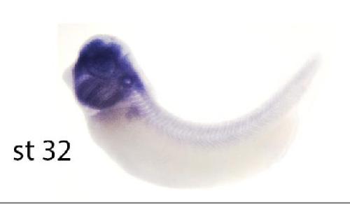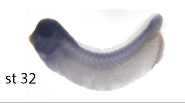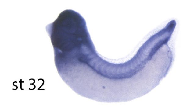 efna2 (ephrin A2) gene expression in X. laevis embryo, assayed whole-mount via situ hybridization (WISH) at NF stage 32, lateral view anterior left, dorsal up. |
