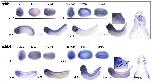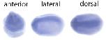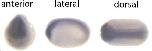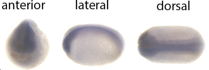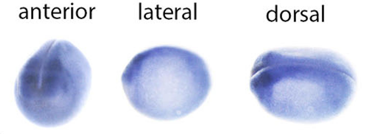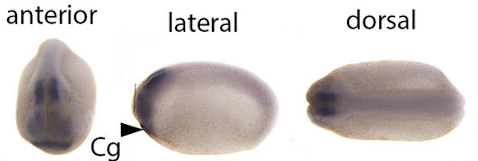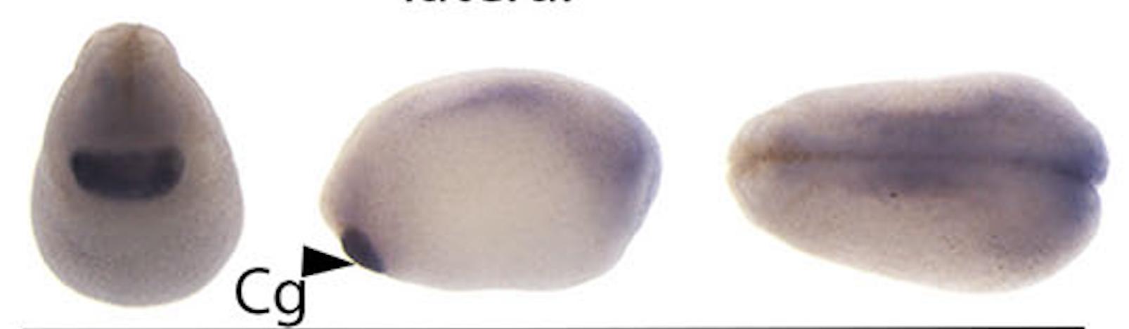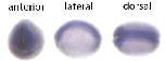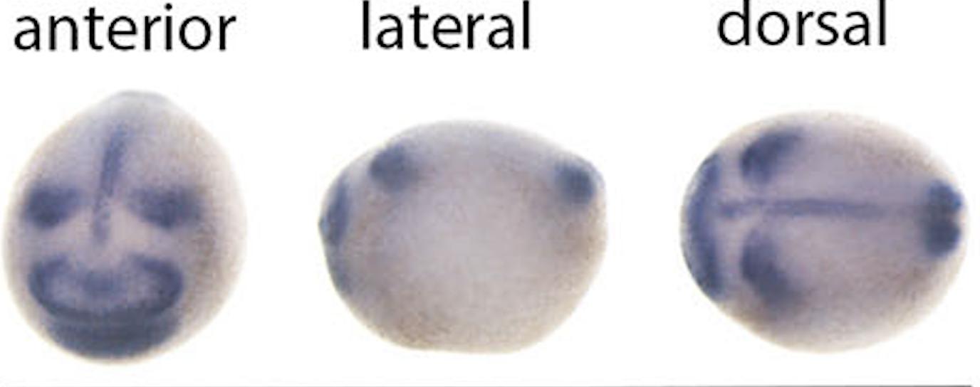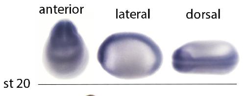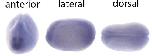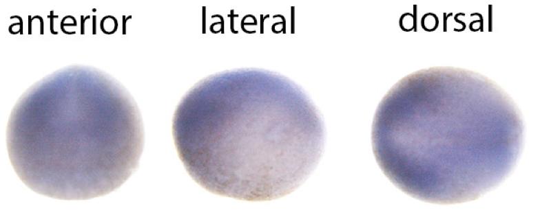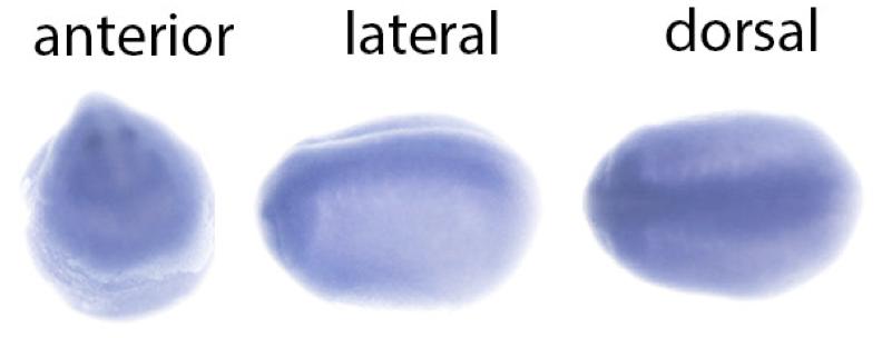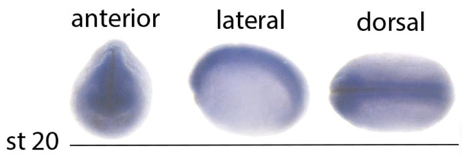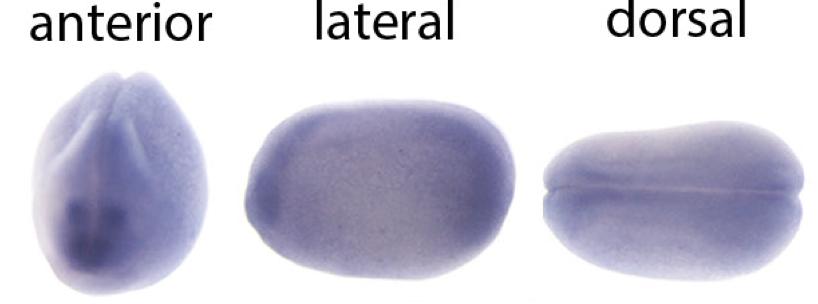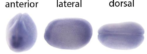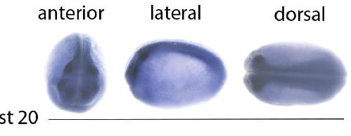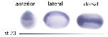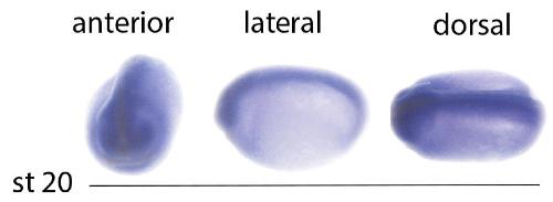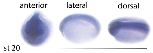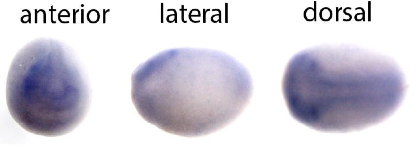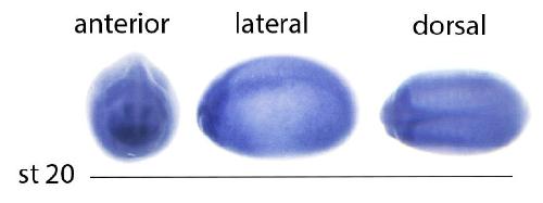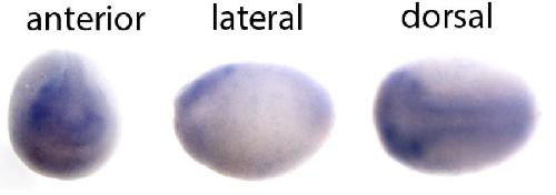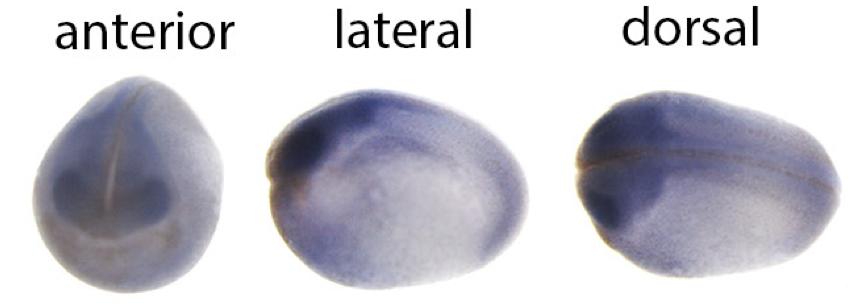 efnb1 (ephrin B1) gene expression in X. laevis embryo, assayed whole-mount via in situ hybridization (WISH) at NF stage 20, nterior, lateral and dorsal views. |
