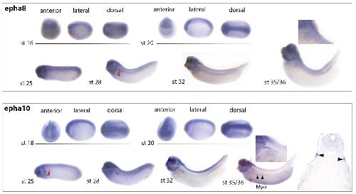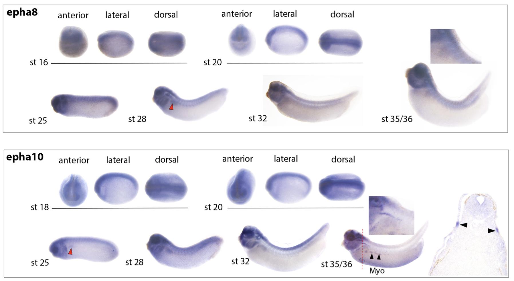 Supplemental Fig. 4. [epha8 and epha10] Expression of genes encoding receptors epha8, epha10, ..... at stages of pronephric development from kidney field (neurula stages 16-18) to functional pronephros (early tadpole stage 35/36). Anterior, dorsal and lateral views are shown at neurula stages (st16-18 and 20). Only lateral views are shown for tailbud stages 25, 28 and 32. A lateral view with the enlarged pronephric region is shown at early tadpole stage 35/36. Images of sectioned st 35/36 embryos are shown for epha10... with red dotted lines indicating the corresponding levels on whole mounts (note that the sections were not made from the whole mount specimen shown). Epha8 expression is observed in the developing pronephros (red arrowhead) from tailbud stage 28, while epha10 is transiently detected in the pronephros (red arrowhead) from tailbud stage 25 to 32. At tadpole stage 35/36 epha10 is not anymore expressed in pronephros, but rather in migrating hypaxial myoblasts (Myo). ..... Scale bar: 1.7 mm for whole embryo, 0.5 mm for embryo magnification and 280 μm for section. |