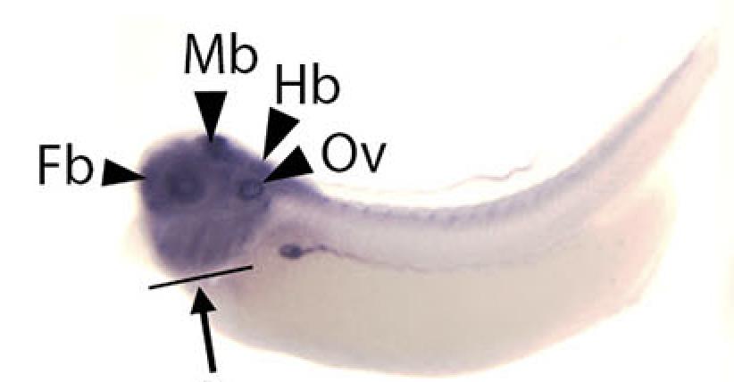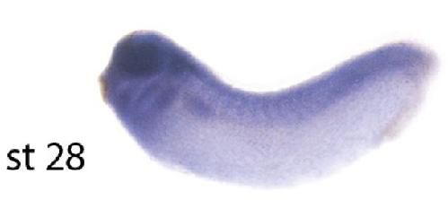efnb2 (ephrin B2) gene expression in X. laevis embryo, assayed whole-mount via situ hybridization (WISH) at NF stage 28, lateral view anterior left, dorsal up. |