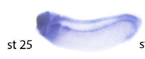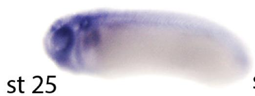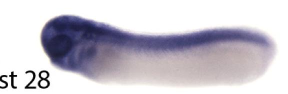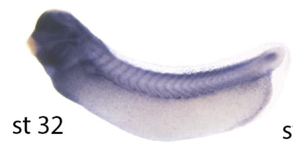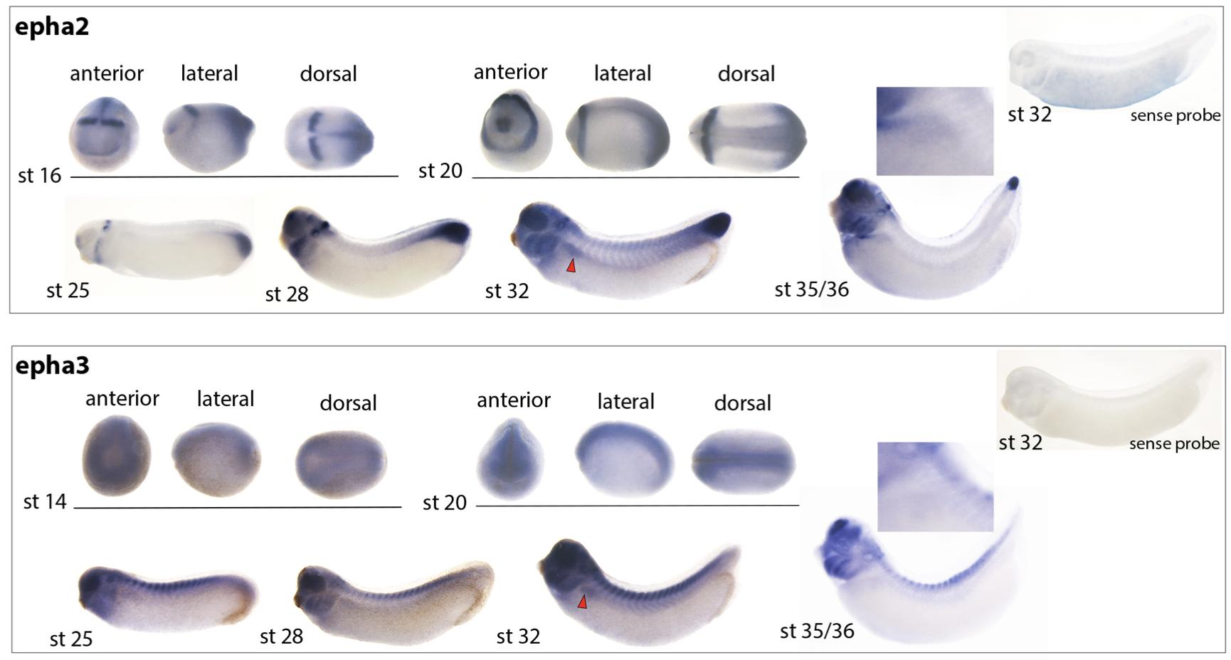 Supplemental Fig. 3. [epha2 and epha3] Expression of genes encoding receptors epha2, epha3, ..... at stages of pronephric development from kidney field (neurula stages 14-18) to functional pronephros (early tadpole stage 35/36). Anterior, dorsal and lateral views are shown at neurula stages (st14-18 and 20). Only lateral views are shown for tailbud stages 25, 28 and 32. A lateral view with the enlarged pronephric region is shown at early tadpole stage 35/36. Expression of epha2, a3 and a5 is observed in the region of the developing pronephros from stage 32 onward. .... For epha2, and epha3 .... in situ hybridization with the sense probes was shown at stage 32 as control. Scale bar: 1.7 mm for whole embryo, 0.5 mm for embryo magnification. |