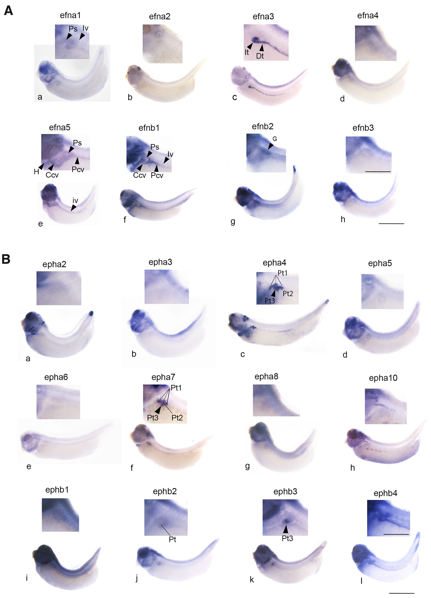 Fig. 1. Expression of genes encoding the members of the Eph-ephrin signaling components in the pronephros at early tadpole stage 35/36. The enlarged region corresponding to the pronephric region is shown with a general view of the tadpole. (A) Genes encoding ephrin ligands. Expression of efna3 and b2 is detected in the developing pronephros; efna3 is expressed in the intermediate and distal segments of the tubule (It, Dt). Expression of efnb2 is observed in the glomus region (G). Expression of efna5 and b1 is detected at the level of the vessels associated with the pronephros: in the pronephric sinus (Ps), the posterior cardinal vein (Pcv), the common cardinal vein (Ccv) and the intersomitic veins (Iv). Efna5 expression is also observed in the heart (H). Efna1 seems to be weakly expressed in the pronephric sinus and intersomitic vein. Scale bars: 0.8 mm for whole embryo and 0.3 mm for embryo magnification. (B) Genes encoding Eph receptors. Expression of epha4, a7, b3 and b2 are clearly detected in the pronephros. Epha4 and EphA7 are expressed in the PT1, PT2 and PT3 segments of the proximal tubule (Pt1, three lines, Pt2, line and Pt3 arrowhead) while ephb3 is detected only in PT3 (arrowhead). Ephb2 is detected in the proximal, intermediate and the first distal segment of the tubule. No pronephric expression of epha2, a3, a5, a6, a8, a10 and b1 is observed. Expression of ephb4 is detected in the vessels associated with the pronephros. Pt, It, Dt: proximal, intermediate and distal tubule. Scale bars: 1.7 mm for whole embryo and 0.5 mm for embryo magnification. |