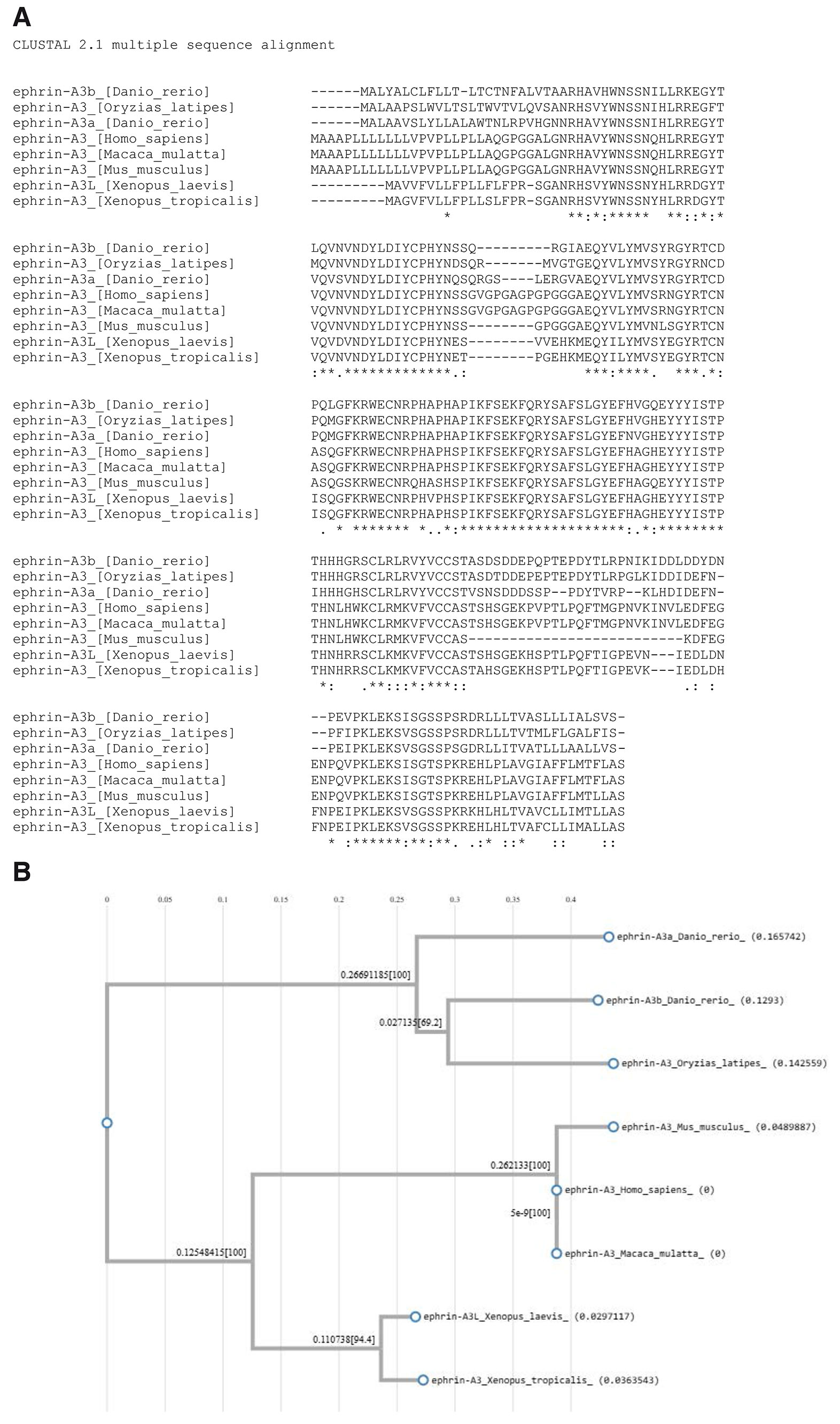 (A) Multiple alignment of vertebrate efna3 protein sequences. (B) Phylogenetic tree. List of accession numbers used for sequences analysis is shown in the Materials and Methods section. |