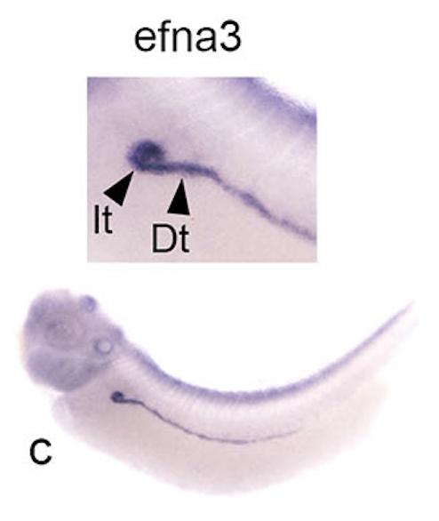 efna5 (ephrin A5) gene expression in X. laevis embryo, assayed whole-mount via in situ hybridization (WISH) at NF stage 35 & 36, lateral view anterior left, dorsal up. |