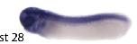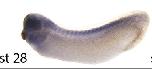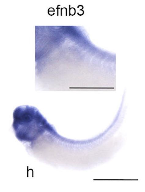 efnb3 (ephrin B3) gene expression in X. laevis embryo, assayed whole-mount via situ hybridization (WISH) at NF stage 28, lateral view anterior left, dorsal up. |