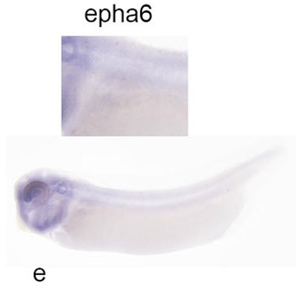 epha6 (EPH receptor A6) gene expression in X. laevis embryo, assayed whole-mount via situ hybridization (WISH) at NF stage 28, lateral view anterior left, dorsal up. |
