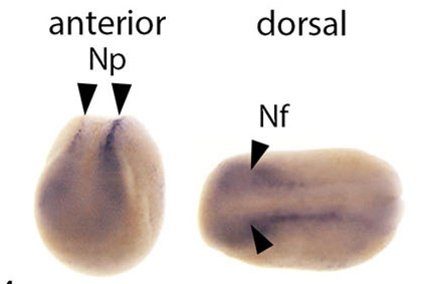 efna3 (ephrin A3) gene expression in X. laevis embryo, assayed whole-mount via situ hybridization (WISH) at NF stage 14 anterior and dorsal views, illustrating expression in the primary neuronal precursors (Np), and in the anterior neural folds (Nf). |