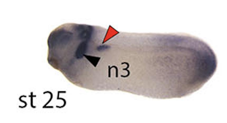 efna3 (ephrin A3) gene expression in X. laevis embryo, assayed whole-mount via situ hybridization (WISH) at NF stage 20, anterior view, dorsal up. showing expression in the neural tube, and in the emerging first (n1) and third/fourth (n3, n4) pharyngeal arches of the cranial neural crest. |