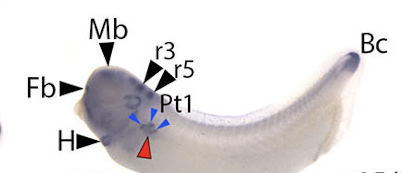 efnb3 (ephrin B3) gene expression in X. laevis embryo, assayed whole-mount via situ hybridization (WISH) at NF stage 32, lateral view anterior left, dorsal up. |