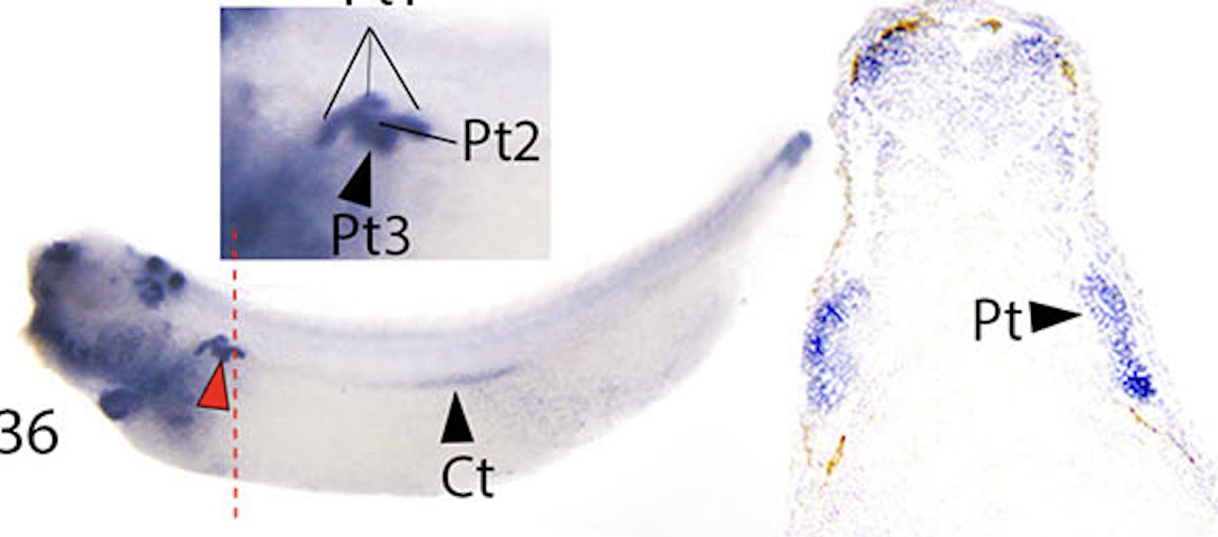 epha6 (EPH receptor A6) gene expression in X. laevis embryo, assayed whole-mount via situ hybridization (WISH) at NF stage 20, anterior, lateral and dorsal views. |
