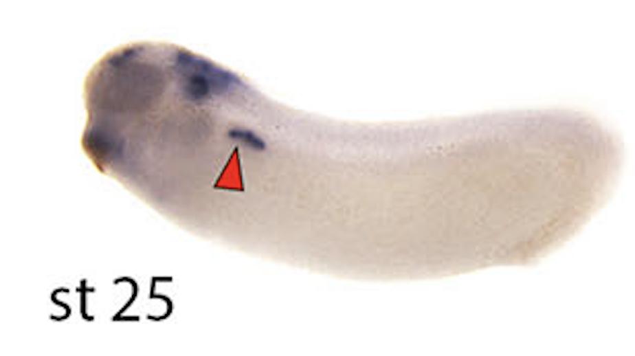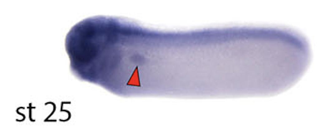 efna1 (ephrin A1) gene expression in X. laevis embryo, assayed whole-mount via situ hybridization (WISH) at NF stage 25, lateral view, anterior left, dorsal up. |