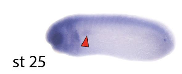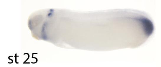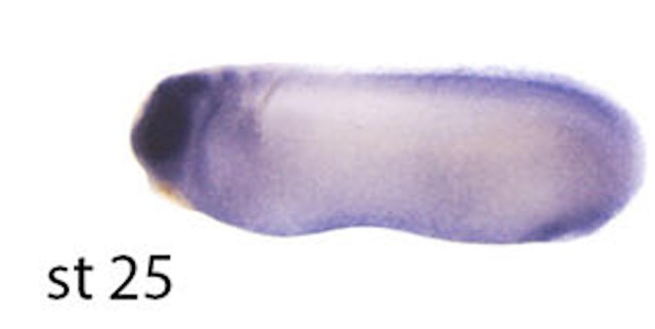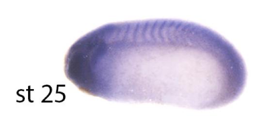 efna4 (ephrin A4) gene expression in X. laevis embryo, assayed whole-mount via in situ hybridization (WISH) at NF stage 25, lateral view anterior left, dorsal up. |
