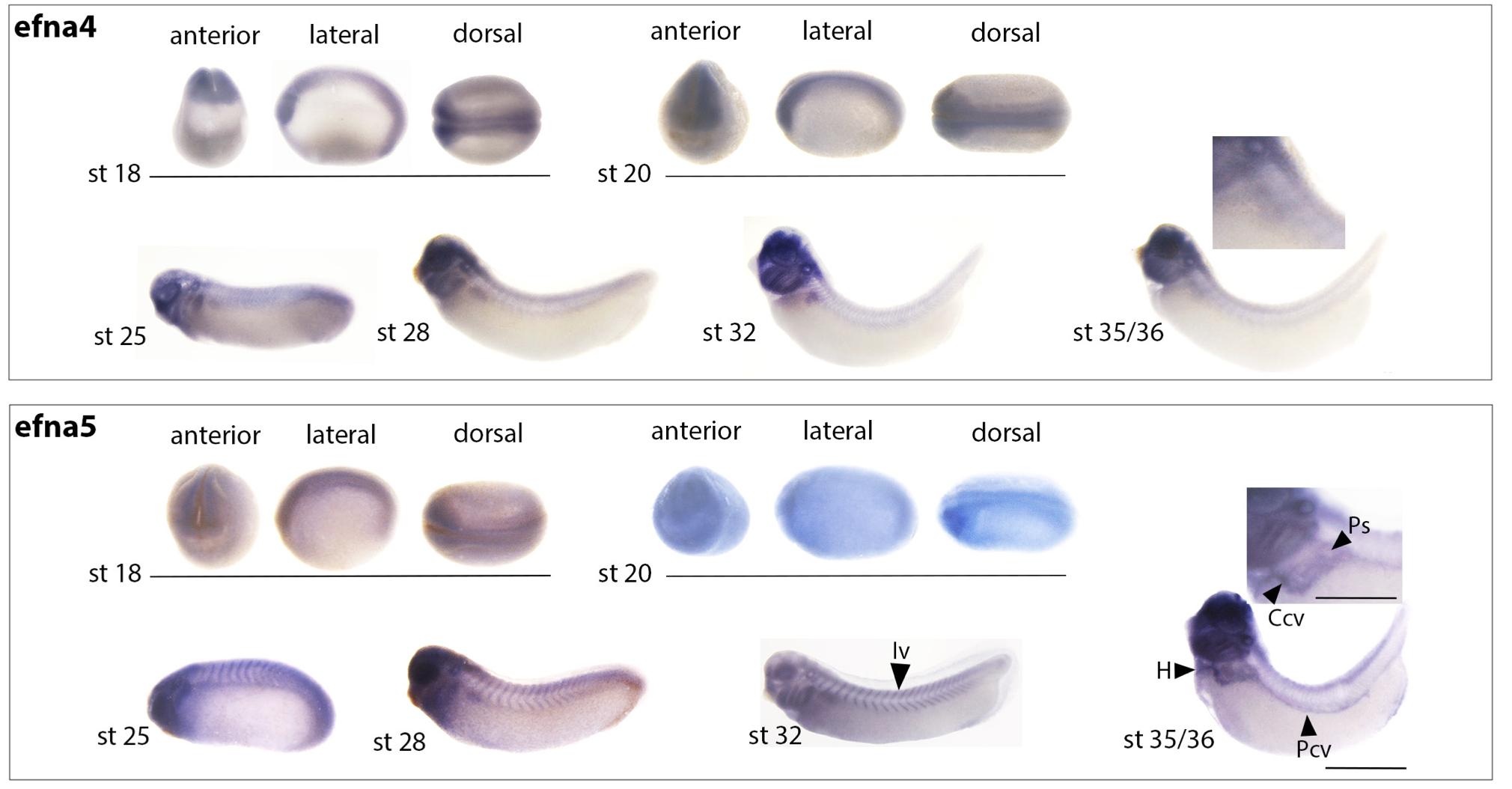 Supplemental Fig. 1. [efna4 and efna5] Expression of genes encoding ephrin-a ligands at stages of pronephric development from kidney field (neurula stages 17-18) to functional pronephros (early tadpole stage 35/36), except for efna3 that is shown in detail in Fig.3. Anterior, dorsal and lateral views are shown at neurula stages (stages 17-18, 20). Only lateral views are shown for tailbud stages 25, 28 and 32. A lateral view with the enlarged pronephric region is shown at early tadpole stage 35/36. From stage 25 onward, low levels of efna1 and a4 expression are detected at the level of the pronephric primordium, possibly in the associated developing vasculature. .... Expression of efna5 in the pronephric region is observed in the pronephric sinus (Ps). It is also observed in the vascular system, the intersomitic veins (Iv), the posterior cardinal vein (Pcv), the common cardinal vein (Ccv) and the heart (H). .....Scale bars: 1.7 mm for whole embryo, 0.5 mm for embryonic magnification. |