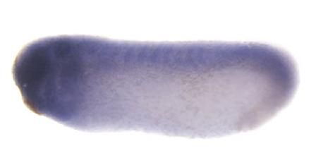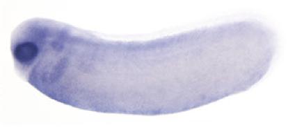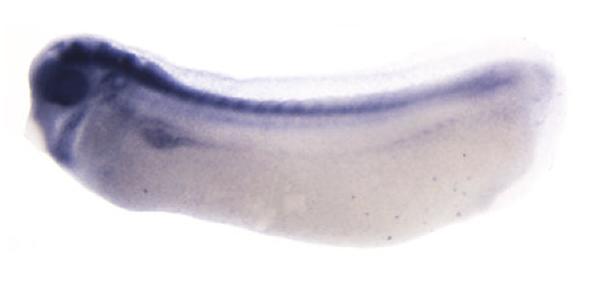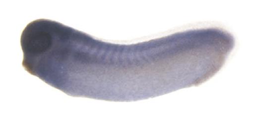 efna2 (ephrin A2) gene expression in X. laevis embryo, assayed whole-mount via situ hybridization (WISH) at NF stage 35/36, lateral view anterior left, dorsal up. |