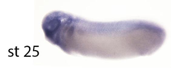 efna3 (ephrin A3) gene expression in X. laevis embryo, assayed whole-mount via situ hybridization (WISH) at NF stage 25, dorsal view, anterior left, showing expression in craniial neural crest streams of the first pharygeal arch around the eye, dorsal aspects of neural tube and as well as the third and fourth pharyngeal arches . |