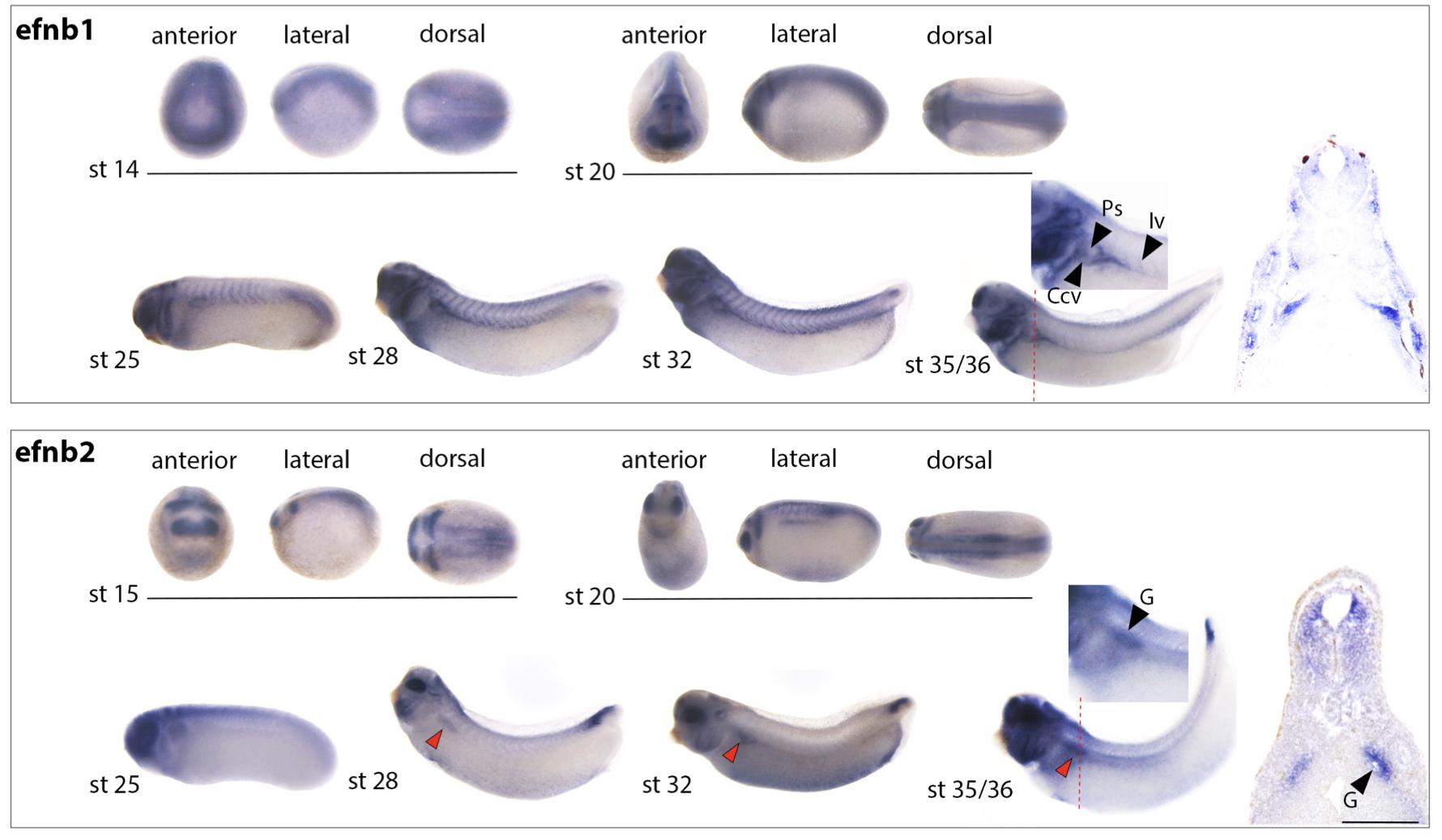 Supplemental Fig. 2. [efnb3] Expression of genes encoding ephrin-b ligands at stages of pronephric development from kidney field (neurula stages 14-18) to functional pronephros (early tadpole stage 35/36). Anterior, dorsal and lateral views are shown at neurula stages (st14-18 and 20). Only lateral views are shown for tailbud stages 25, 28 and 32. A lateral view with the enlarged pronephric region is shown at early tadpole stage 35/36. ....Efnb3 is not expressed in the developing pronephros. The red arrowheads indicate the pronephric anlage at stage 28 and the pronephros at stage 32 and 35/36. Scale bars: 1.7 mm for whole embryo, 0.5 mm for embryonic magnification and 280 μm for section. |