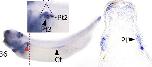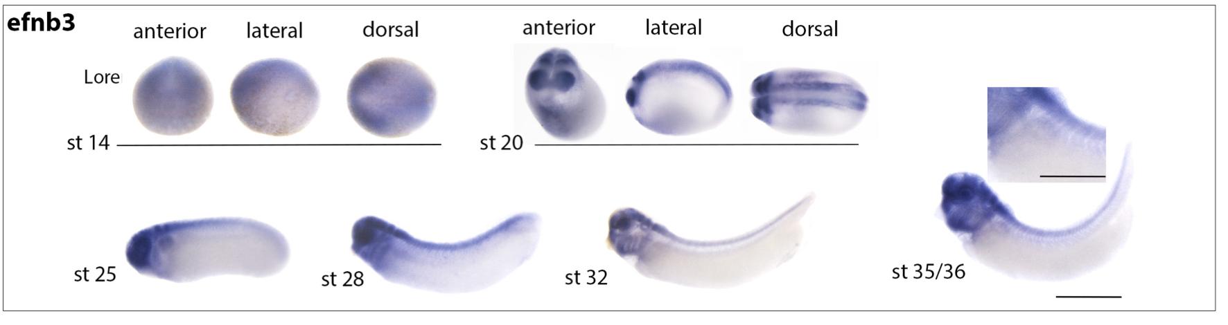 efnb3 (ephrin B3) gene expression in X. laevis embryo, assayed whole-mount via situ hybridization (WISH) at NF stage 20, anterior, lateral and dorsal views. |