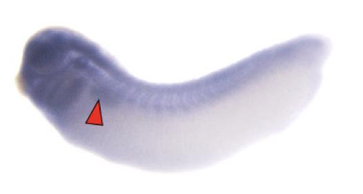 efnb2 (ephrin B2) gene expression in X. laevis embryo, assayed whole-mount via situ hybridization (WISH) at NF stage 25, lateral view anterior left, dorsal up. |