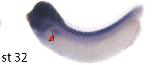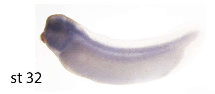 efna4 (ephrin A4) gene expression in X. laevis embryo, assayed whole-mount via in situ hybridization (WISH) at NF stage 32, lateral view anterior left, dorsal up. |