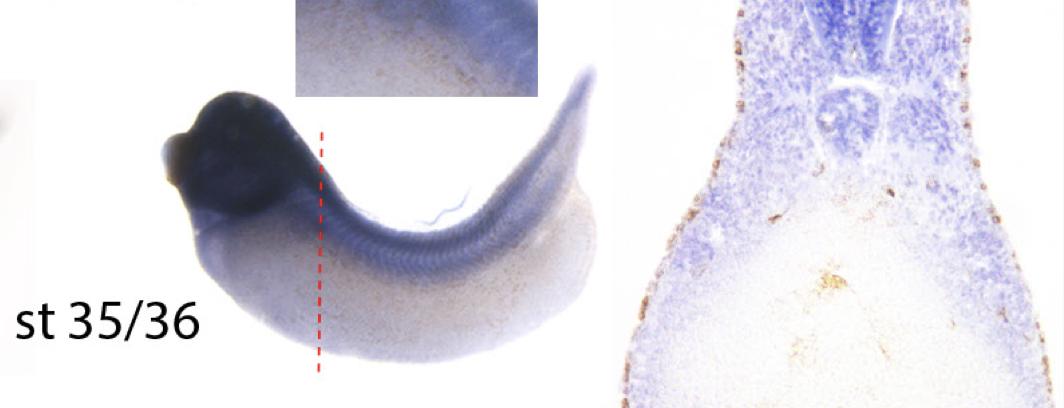 epha7 (EPH receptor A7) gene expression in X. laevis embryo, assayed whole-mount via situ hybridization (WISH) at NF stage 35 & 36, left image: lateral view, anterior left, dorsal up; right image: transverse section through trunk as level of red line. |