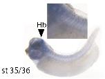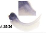 ephb3 (EPH receptor B3) gene expression in X. laevis embryo, assayed whole-mount via situ hybridization (WISH) at NF stage 35 & 36, lateral view, anterior left, dorsal up. |