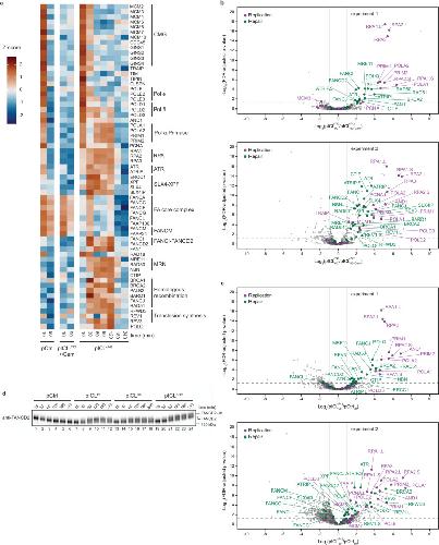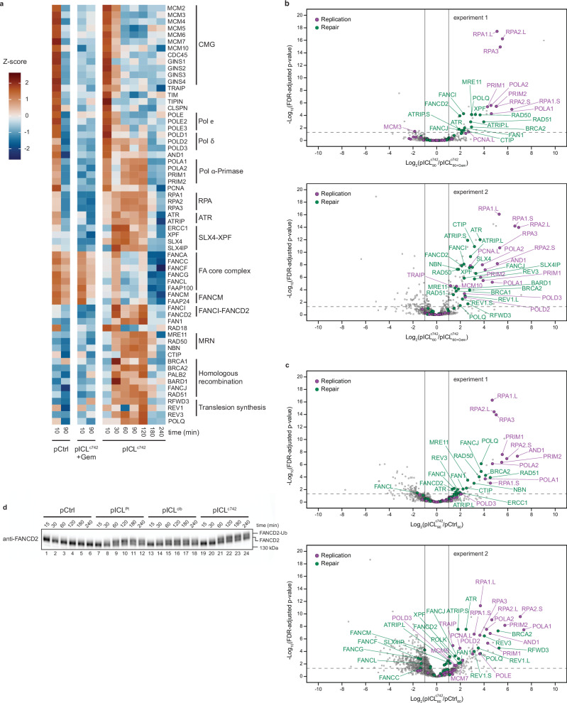 Fig. 2. FA pathway mobilization during pICLc742 replication.a pCtrl and pICLc742 were replicated in egg extract. Where indicated, the extract was supplemented with Geminin (+Gem) to inhibit replication. Plasmids were recovered from the extract, and chromatin-associated proteins were quantified by mass spectrometry. The heatmap shows the Z-scored median log2LFQ (label-free quantification) intensity from three samples collected from the same replication reaction (i.e., technical replicates). b Volcano plots comparing the recruitment of proteins to pICLc742 in replicating extract (pICL) vs non-replicating extract (pICL+Gem) at 90 min (experiment 1, top) or 60 min (experiment 2, bottom) following replication initiation. The estimated fold change (FC) in normalized protein intensity between the samples is plotted against false discovery rate (FDR)-adjusted p value (calculated with a two-sided moderated t-test and corrected for multiple hypothesis testing). Labeled proteins of interest meet significance criteria (|Log2FC| ≥ 1 and p ≤ 0.05). c Volcano plots comparing the recruitment of proteins to pICLc742 vs pCtrl at 90 min (experiment 1, top) or 60 min (experiment 2, bottom) following replication initiation. Estimated fold changes and FDR-adjusted p values were calculated as in (b). Labeled proteins of interest meet significance criteria (|Log2FC| ≥ 1 and p ≤ 0.05). d The indicated plasmids were replicated in egg extract, and the extract proteins were resolved by SDS-PAGE and blotted for FANCD2. In the presence of an ICL, FANCD2 becomes monoubiquitylated, resulting in a slower migrating band. |