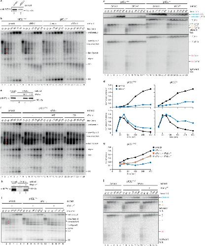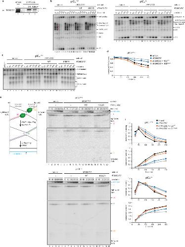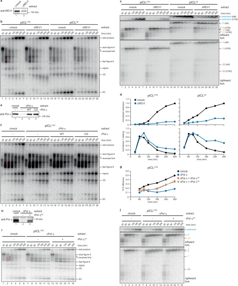 Fig. 4. Translesion synthesis during colibactin-induced ICL repair.a REV1 immunodepletion. The extracts used in the replication reactions shown in (b, c) were blotted for REV1. b pICLc742 and pICLclb were replicated with [α−32P]dCTP in mock- or REV1-depleted extracts, and replication intermediates were analyzed as in Fig. 1d. SC supercoiled, OC open circular. Red arrowheads indicate pICLc742-specific repair intermediates. c Nascent DNA strands from the pICLc742 and pICLclb replication reactions shown in (b) were digested with AflIII and EcoRI and analyzed as in Fig. 1f. d Rightward fork −1 stall products and extension products for the replication reactions shown in (c) were quantified as in Fig. 3f. e Pol κ immunodepletion. The extracts used in the replication reactions shown in (f) were blotted for Pol κ. f pICLc742 was replicated with [α−32P]dCTP in mock- or Pol κ-depleted extracts supplemented with rPol κ, as indicated, and replication intermediates were analyzed as in Fig. 1d. SC supercoiled, OC open circular. Red arrowheads indicate top and bottom intermediates formed during replication of pICLc742. g TLS efficiencies for the replication reactions shown in (f) were quantified as the intensity of supercoiled plasmid relative to combined intensities of open circular and supercoiled plasmids (SC/OC + SC). h Pol η immunodepletion. The extracts used in the replication reactions shown in (i, j) were blotted for Pol η. Asterisk indicates a non-specific band. i pICLc742 was replicated with [α−32P]dCTP in mock- or Pol η-depleted extracts supplemented with rPol η, as indicated. Replication intermediates were analyzed as in Fig. 1d. SC supercoiled, OC open circular. Red arrowheads indicate pICLc742-specific repair intermediates. j Nascent DNA strands from the pICLc742 replication reactions shown in (i) were digested with AflIII and EcoRI and analyzed as in Fig. 1f. |