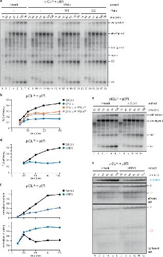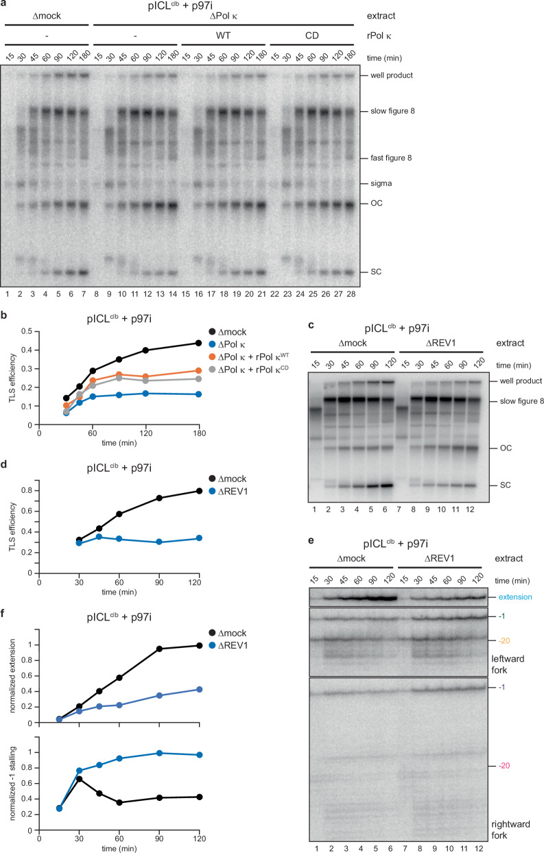 Fig. 5. Translesion synthesis during bypass of a colibactin-induced monoadduct.a pICLclb was replicated with [α−32P]dCTP in mock- or Pol κ-depleted extracts supplemented with p97 inhibitor and rPol κ, as indicated, and replication intermediates were analyzed as in Fig. 1d. SC supercoiled, OC open circular. b TLS efficiencies for the replication reactions shown in (a) were quantified as in Fig. 4g. c pICLclb was replicated with [α−32P]dCTP in mock- or REV1-depleted extracts supplemented with p97 inhibitor, and replication intermediates were analyzed as in Fig. 1d. SC supercoiled, OC open circular. d TLS efficiencies for the replication reactions shown in (c) were quantified as in Fig. 4g. e Nascent DNA strands from the pICLclb replication reactions shown in (c) were digested with AflIII and EcoRI and analyzed as in Fig. 1f. f Rightward fork −1 stall products and extension products for the replication reactions shown in (e) were quantified as in Fig. 3f. |