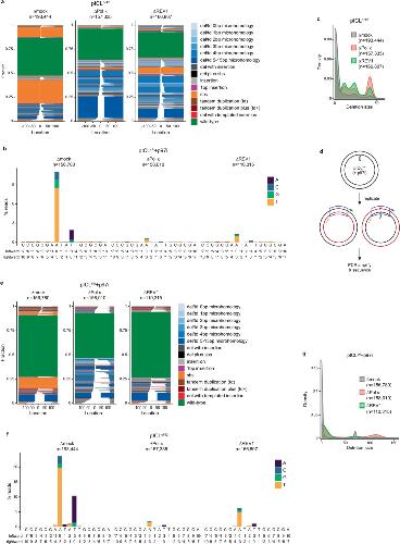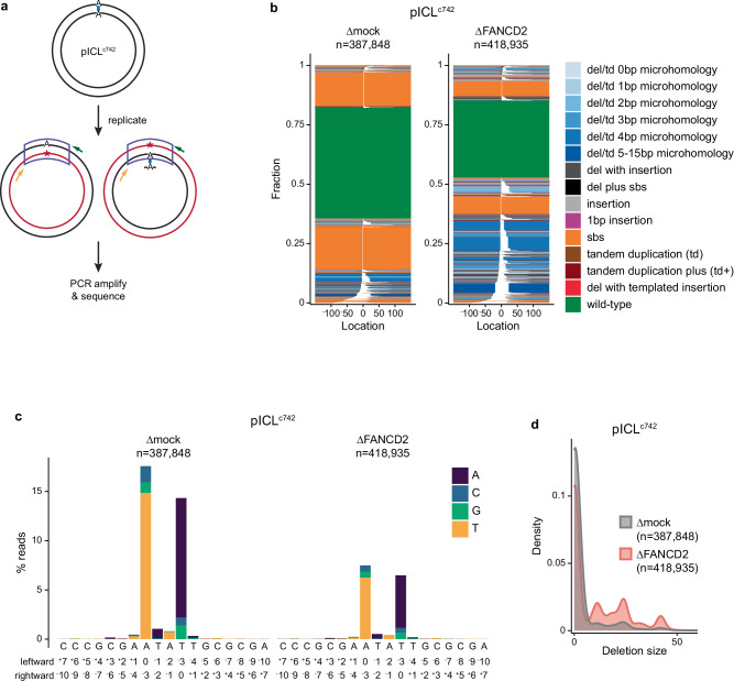 Fig. 6. Mutagenic repair of colibactin-induced ICLs by the FA pathway.a Schematic depicting analysis of pICLc742 repair products by next-generation sequencing. Blue and green arrows indicate PCR primers; red asterisk indicates a potential point mutation. b pICLc742 was replicated in mock- or FANCD2-depleted extract, and repair products were PCR amplified and sequenced. Raw paired-end sequencing reads were merged using SIQ, and data were visualized with SIQPlotteR. Color-coded repair outcomes are depicted as tornado plots. White spaces depict deletions. The positions of variations are indicated relative to the AATATT cross-link site (“0”). n indicates the number of mapped sequencing reads obtained for each condition. c The percentage of reads containing single-base substitutions at the indicated positions relative to the ICL is plotted for the data sets described in (b). The reference sequence is shown with numbers indicating the positions for the rightward and leftward nascent leading strands relative to the site of cross-linking (“0”). n indicates the number of mapped sequencing reads obtained for each condition. d The fraction of deletions spanning a given length is plotted for the data sets described in (b). n indicates the number of mapped sequencing reads obtained for each condition. |