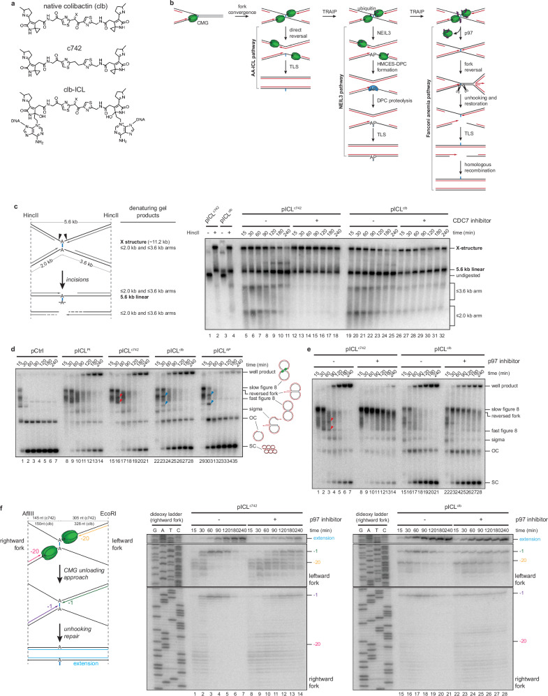 Fig. 1. Replication-coupled repair of colibactin-induced ICLs.a Structures of the native colibactin toxin (top; X indicates O or NH2), stabilized c742 colibactin analog (middle), and the colibactin-induced ICL (clb-ICL; bottom). b Schematic of replication-coupled ICL repair pathways (see main text for details). Black, parental DNA strands. Red, nascent DNA strands. Blue, ICL. Purple, ubiquitin. c Left, schematic of species generated during ICL repair. Digestion with HincII produces X-shaped structures corresponding to cross-linked plasmids and linear species corresponding to unhooked plasmids. Right, pICLc742 and pICLclb were replicated in egg extract supplemented with CDC7 inhibitor, as indicated. Recovered replication intermediates were digested with HincII and resolved on a denaturing (alkaline) agarose gel. Intermediates were detected by Southern blotting with 32P radiolabeled probes and visualized by autoradiography. d The indicated plasmids were replicated in egg extract supplemented with [α−32P]dCTP. Replication intermediates were separated on a native agarose gel and visualized by autoradiography. Schematics of replication and repair intermediates that are resolved by native agarose gel electrophoresis are shown. SC supercoiled, OC open circular. Red arrowheads indicate unique intermediates formed during replication of pICLc742; blue arrowheads indicate OC-OC catenae and OC-SC catenae produced during replication of pICLAP and pICLclb. e pICLc742 and pICLclb were replicated in egg extract supplemented with [α−32P]dCTP and p97i, as indicated. Replication intermediates were analyzed as in (d). Red arrowheads indicate pICLc742-specific repair intermediates. f Left, schematic of nascent leading strands generated during ICL repair. AflIII cuts 145 or 150 nt to the left of the c742-ICL or clb-ICL, respectively. EcoRI cuts 305 or 328 nt to the right of the c742-ICL or clb-ICL, respectively. Digestion with AflIII and EcoRI generates characteristic nascent strand −20 to −40 stall, −1 stall, and extension products. Right, DNA recovered from the pICLc742 and pICLclb replication reactions shown in (e) was digested with AflIII and EcoRI and resolved on a denaturing polyacrylamide sequencing gel. Top, middle, and bottom panels show sections of the same gels that contain the extension products, leftward fork leading strands, and rightward fork leading strands, respectively. |