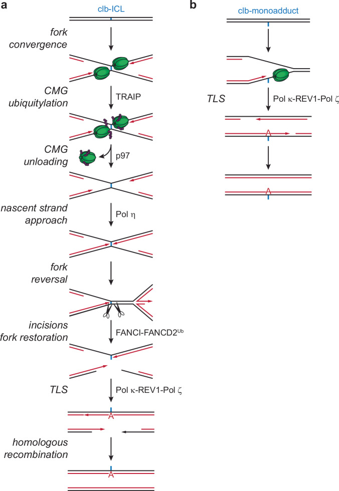 Fig. 8. Model for repair of colibactin-induced DNA damage.a Fork convergence at a colibactin-induced ICL activates CMG ubiquitylation and unloading. Pol η promotes extension of nascent leading strands up to the ICL. Following reversal of one fork, monoubiquitylated FANCI-FANCD2 directs nucleolytic incisions that unhook the ICL and generate a DSB. A TLS polymerase complex that includes REV1 and Pol κ enables mutagenic extension of the nascent strand past the unhooked ICL remnant, potentially introducing a T>A point mutation at the site of alkylation. The DSB intermediate is then repaired through homologous recombination. b A colibactin monoadduct encountered by the replication fork is bypassed by a TLS polymerase complex that includes REV1 and Pol κ. Extension of the nascent strand past the adduct is potentially mutagenic, introducing a T>A point mutation at the site of alkylation. |
