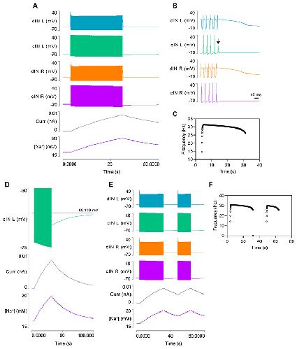 Fig. 3. Model 2 output after adding dynamic sodium pumps to cINs.A: Swim episodes elicited with the same stimulus regime as used in Model 1 (Fig. 1C) now self-terminate. Traces from top: left dIN, left cIN, right dIN, right cIN, pump current in left cIN, [Na+]i in left cIN. B: Expanded neuron traces of (A) reveal that the swim episode terminates due to spike failure in the left cIN (arrow). C: The cycle frequency of the left CIN during a swim episode. D: An enlarged view of part of (A) shows the usAHP and its recovery in the left cIN. E: Eliciting a second swim episode with the same stimulus regime shortly after termination of the first reveals STMM. F: The cycle frequency profile of (E). |