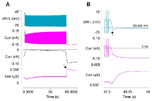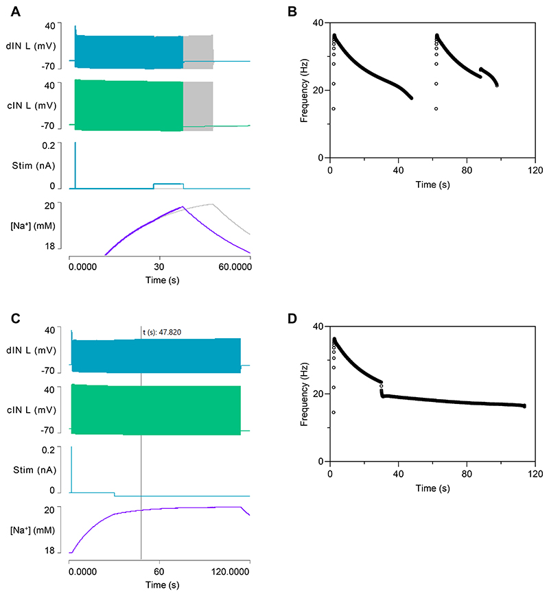 Fig. 9. Factors contributing to cIN spike failure and swim episode termination.A: There is a small but progressive de-inactivation of the A current in a cIN during a swim episode, and the sodium equilibrium potential declines. Traces from top: sodium equilibrium potential (magenta), membrane potential (green), inactivation gate open probability of the channel mediating IA (note small scale). B: Compensating for the hyperpolarizing pump current in cINs by injecting a mirror-image depolarizing current. Traces from top: membrane potential, stimulus current [defining equation: t < 4065? 0: 0.01011*(1-exp(-(t-4065)/19865))], pump current, [Na+]i. |