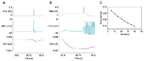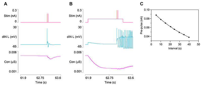 Fig. 8. STMM: initiating episode 2 with 15 s interval from episode 1.A: In the absence of a depolarizing pre-pulse, the recurrent EPSP in a dIN is reduced in amplitude, and the dIN no longer generates a rebound spike. Traces from top: current injected into both dINs, left dIN membrane potential, Ih conductance in left dIN. B: A depolarizing pre-pulse reduces Ih conductance (note the consequent sag in the membrane potential during the depolarizing pre-pulse) and prevents shunting of the recurrent NMDA EPSP, allowing the dIN to generate a rebound spike and initiate swimming. C: The threshold amplitude of the pre-pulse needed to elicit the second stimulus depends on the inter-episode interval. |