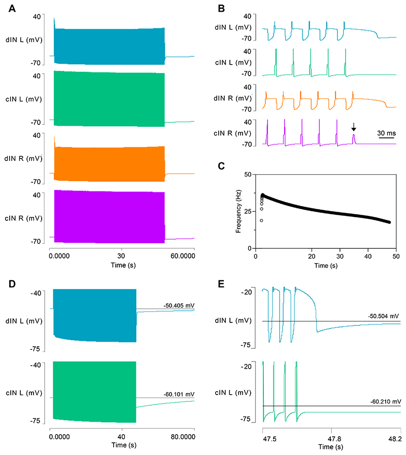 Fig. 4. Model 3 output after adding dynamic sodium pumps and HCN channels to dINs.A: A swim episode generated in the four neurons of the CPG, lasting ~46s. B: Expanded trace reveals that the swim episode in A terminates due to spike failure in the right cIN (arrow). C: The cycle frequency profile during the swim episode. D: Shortly after episode termination, the cIN generates a 5.4 mV usAHP (green, lower trace), while the usAHP in the dIN is only 1.8 mV (blue, upper trace). E: An expanded view of episode termination showing the brief large hyperpolarization of the dIN, followed by the sustained small usAHP. The cIN does not show this biphasic hyperpolarization, but the sustained usAHP is substantially larger than that in the dIN. Spikes truncated in D and E. |