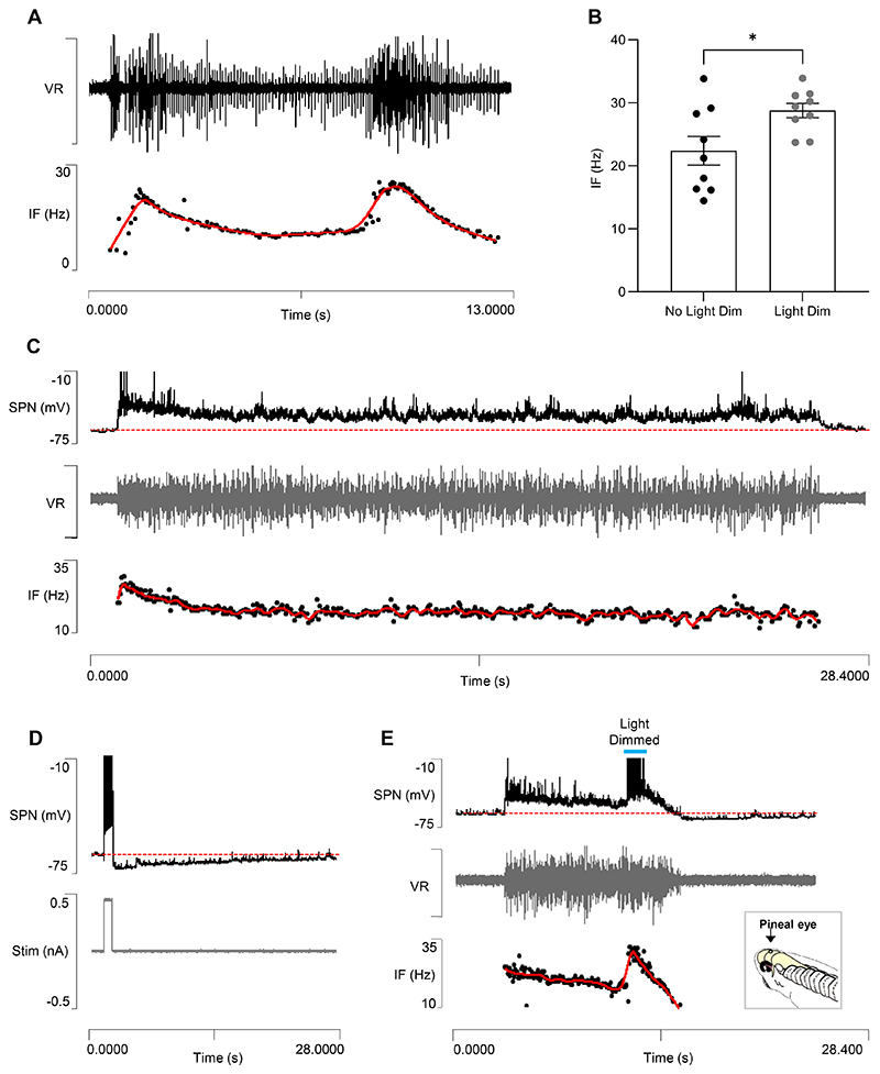 Fig. 11. Swim accelerations and neuron recruitment.A: A ventral root (VR, upper trace) recording from a real tadpole showing a spontaneous increase in burst intensity just before episode termination. A plot of the instantaneous cycle frequency (lower trace) shows that this is accompanied by an increase in frequency. The red line shows the frequency after LOWESS smoothing. B: Light dimming increases the peak instantaneous frequency towards the end of an episode compared to episodes that self-terminate without dimming. Data expressed as mean ± SEM, n=12 preparations. *p<0.05. C: Sample recording showing a stage 42 spinal neuron that only fired at the onset of a spontaneous swim episode (SPN, upper trace, spike peaks clipped). Note that there is no usAHP after the end of the episode (dashed red line shows the RMP). The ventral root recording (VR, middle trace) shows no sign of a terminal burst, and there is no increase in cycle frequency at the end of the episode (lower trace, IF, as in A). D: The same neuron generated a usAHP following a burst of spikes induced by a depolarising current step (lower trace) during a quiescent (non-swimming) period. E: Light dimming part-way through a spontaneous swim episode activates the dorsal forebrain pineal gland (inset arrowed; diagram courtesy of Dr S.R. Soffe, with permission) and induces a burst of spikes in the SPN, which now generates a usAHP at episode termination, which followed shortly after. The ventral root recording (middle trace) and instantaneous cycle frequency plot (lower trace) show the dimming-induced increase in intensity and frequency. |