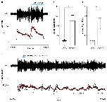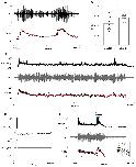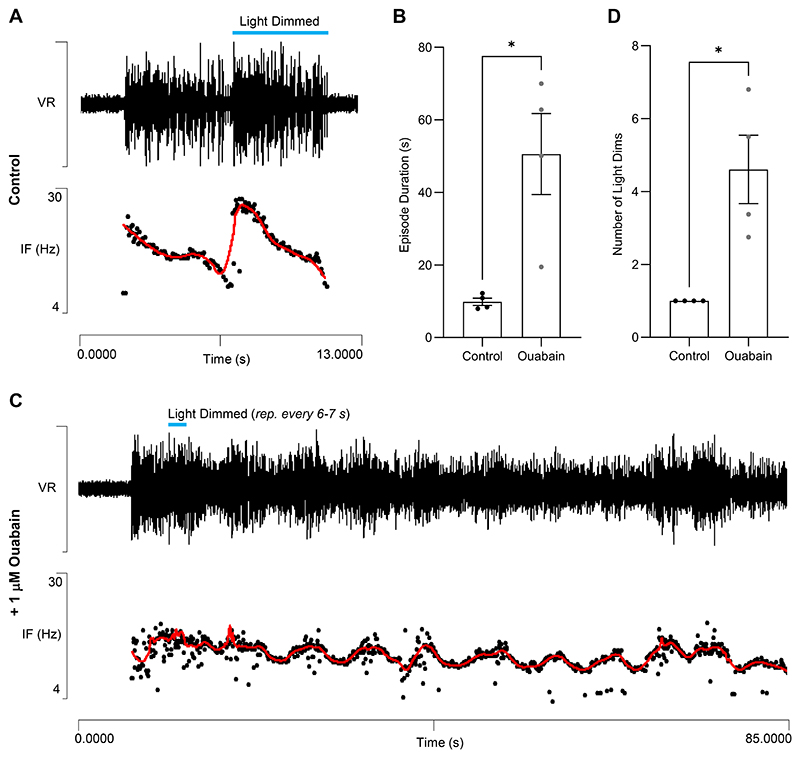 Fig. 12. Sensitivity of light dimming response to ouabain.A: Light dimming caused acceleration in an electrically evoked swim episode prior to its termination (ventral root recording, upper trace; instantaneous frequency, lower trace, red line shows LOWESS smoothing). B: In control conditions (left) a single light dim early in an episode frequently induced termination, but the effect was largely abolished in the presence of ouabain (right). C: In the same preparation following application of 1µM ouabain, repeated dimming by turning the bath illumination off and on caused accelerations with most off stimuli, but swimming continued for ~3 minutes (only the early part of the episode is shown, traces as A). D. In control conditions (left) a single light dim was usually sufficient to induce termination, but in the presence of ouabain (right) episodes frequently continued even after multiple light dims. Data expressed as mean ± SEM, n= 4 preparations. *p<0.05. |