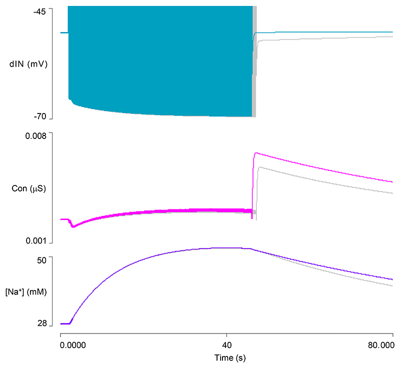Fig. 13. Modulating HCN channel conductance.Additional up-regulation of the HCN channel conductance by right-shifting its activation curve in a sodium concentration-dependent manner can completely cancel the dIN usAHP, while without this shift (gray traces) there is a small but definite residual usAHP. Traces from top: dIN membrane potential (spikes clipped), HCN conductance, [Na]i. |