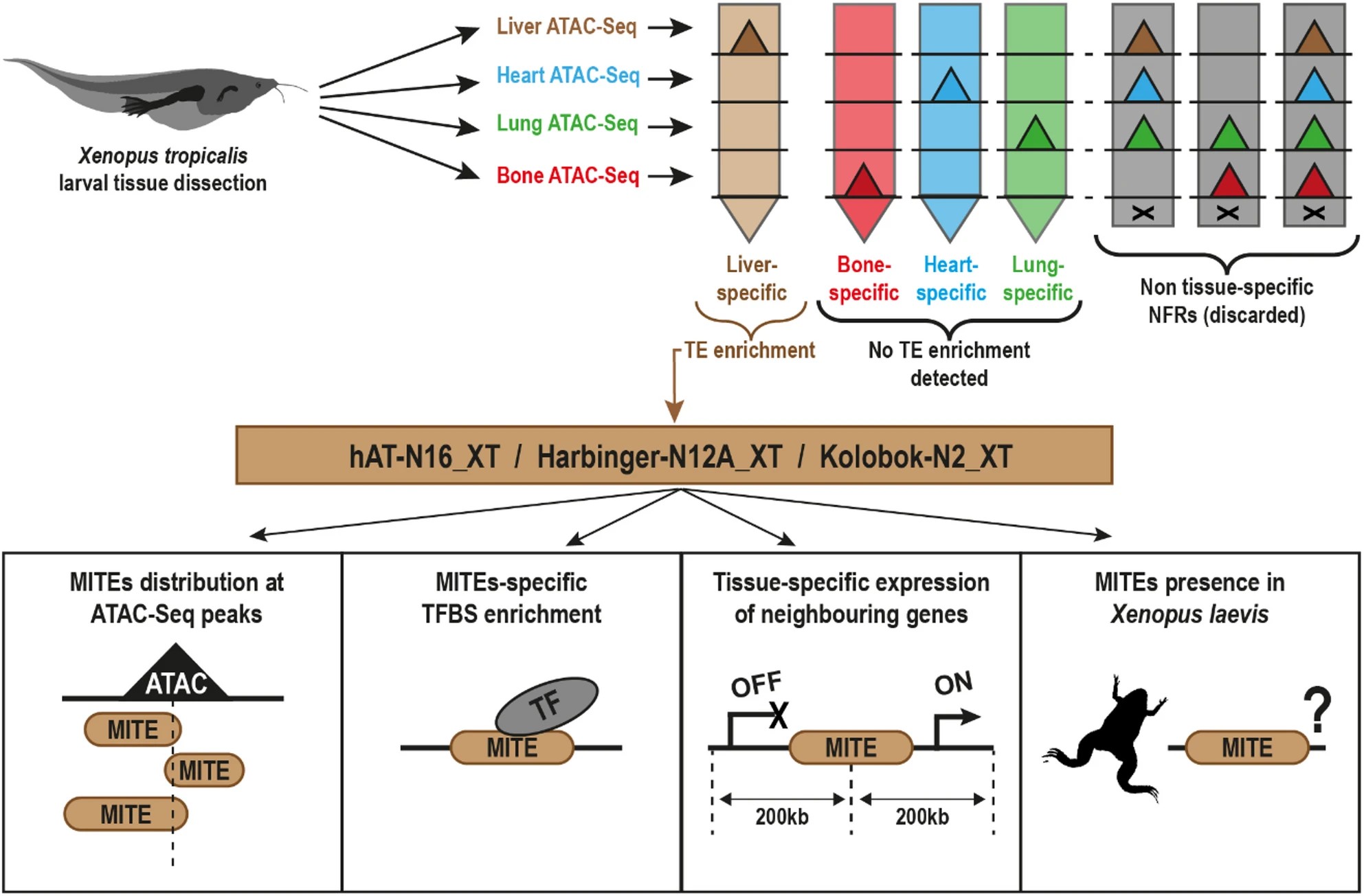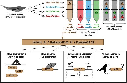 Fig. 1 Experimental design and main analyses. The indicated Xenopus tropicalis larval tissues were subjected to ATAC-Seq, and distal tissue-specific NFR peaks were identified and screened for TE enrichment. Three types of MITEs (hAT-N16_XT, Harbinger-N12A_XT and Kolobok-N2_XT) were found to be enriched at distal liver-specific NFRs and were further analysed for (i) their distribution and orientation at ATAC-Seq peaks, (ii) their TFBS enrichment, (iii) the tissue specificity of their surrounding genes and (iv) their presence at homologous loci in the Xenopus laevis genome