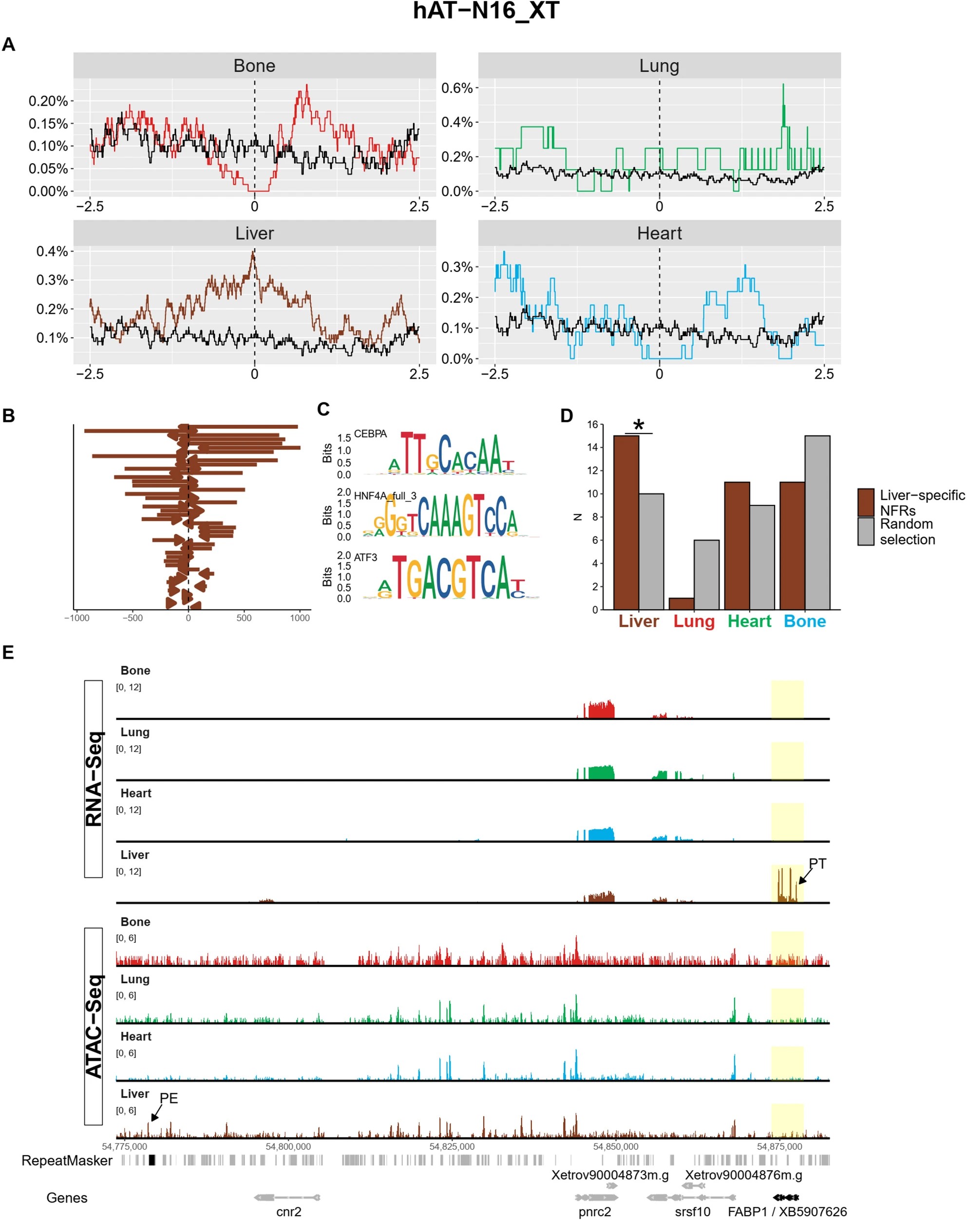 Fig. 2 An analysis of the hAT-N16_XT MITE copies located at liver-specific NFRs. A Relative frequency of the hAT-N16_XT MITE copies in a 5-kb window centered on the NFR peaks specific to the indicated tissues. Random background is shown in black, while red, green, brown and blue lines respectively correspond to bone, lung, liver, and heart-specific NFRs. B Relative positions of the MITE copies overlapping a 1 kb region centered on the liver-specific NFR. MITEs are shown as arrowheads to indicate their polarity and are sorted according to their size from top to bottom. C Motifs of a selection of TFBSs enriched in the identified hAT-N16_XT MITEs. D Comparative analysis of hAT-N16_XT MITEs located at liver-specific NFRs (brown), with a random sample of hAT-N16_XT MITEs excluded from liver-specific ATAC-Seq peaks (grey). The bar plot shows the number of MITEs located within 200 kb of a gene whose expression is specific to liver, lung, heart and bone, as indicated. A binomial test was applied, and statistically significant differences (p-value ≤ 0.05) are marked with an asterisk. E Genomic snapshot of a possible liver-specific regulatory event between a putative enhancer (PE) born from a domesticated hAT-N16_XT MITE (black in the repeat masker line) and its putative target gene fabp1 (PT, yellow box). The colour code of the RNA-Seq and ATAC-Seq tracks is as in (A)