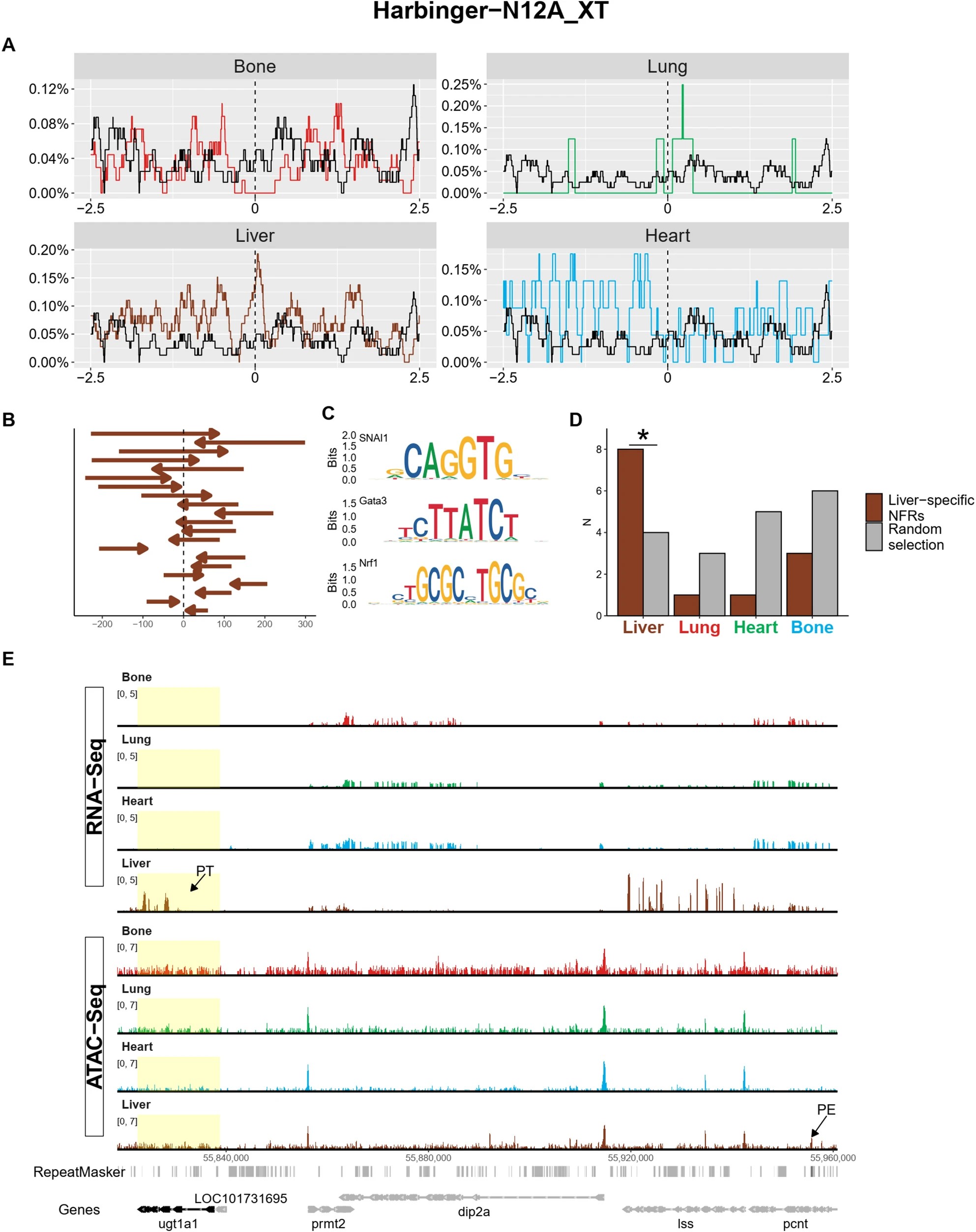 Fig. 3 An analysis of the Harbinger-N12A_XT MITE copies located at liver-specific NFRs. A Relative frequency of the Harbinger-N12A_XT MITE copies in a 5-kb window centered on the NFR peaks specific to the indicated tissues. Random background is shown in black, while red, green, brown and blue lines respectively correspond to bone, lung, liver, and heart-specific NFRs. B Relative positions of the MITE copies overlapping a 1 kb region centered on the liver-specific NFR. MITEs are shown as arrowheads to indicate their polarity and are sorted according to their size from top to bottom. C Motifs of a selection of TFBSs enriched in the identified Harbinger-N12A_XT MITEs. D Comparative analysis of Harbinger-N12A_XT MITEs located at liver-specific NFRs (brown), with a random sample of Harbinger-N12A_XT excluded from liver-specific ATAC-Seq peaks (grey). The bar plot shows the number of MITEs located within 200 kb of a gene whose expression is specific to liver, lung, heart and bone, as indicated. A binomial test was applied, and statistically significant differences (p-value ≤ 0.05) are marked with an asterisk. E Genomic snapshot of a possible liver-specific regulatory event between a putative enhancer (PE) born from a domesticated Harbinger-N12A_XT MITE (black in the repeat masker line) and its putative target gene ugt1a1 (PT, yellow box). The colour code of the RNA-Seq and ATAC-Seq tracks is as in (A)