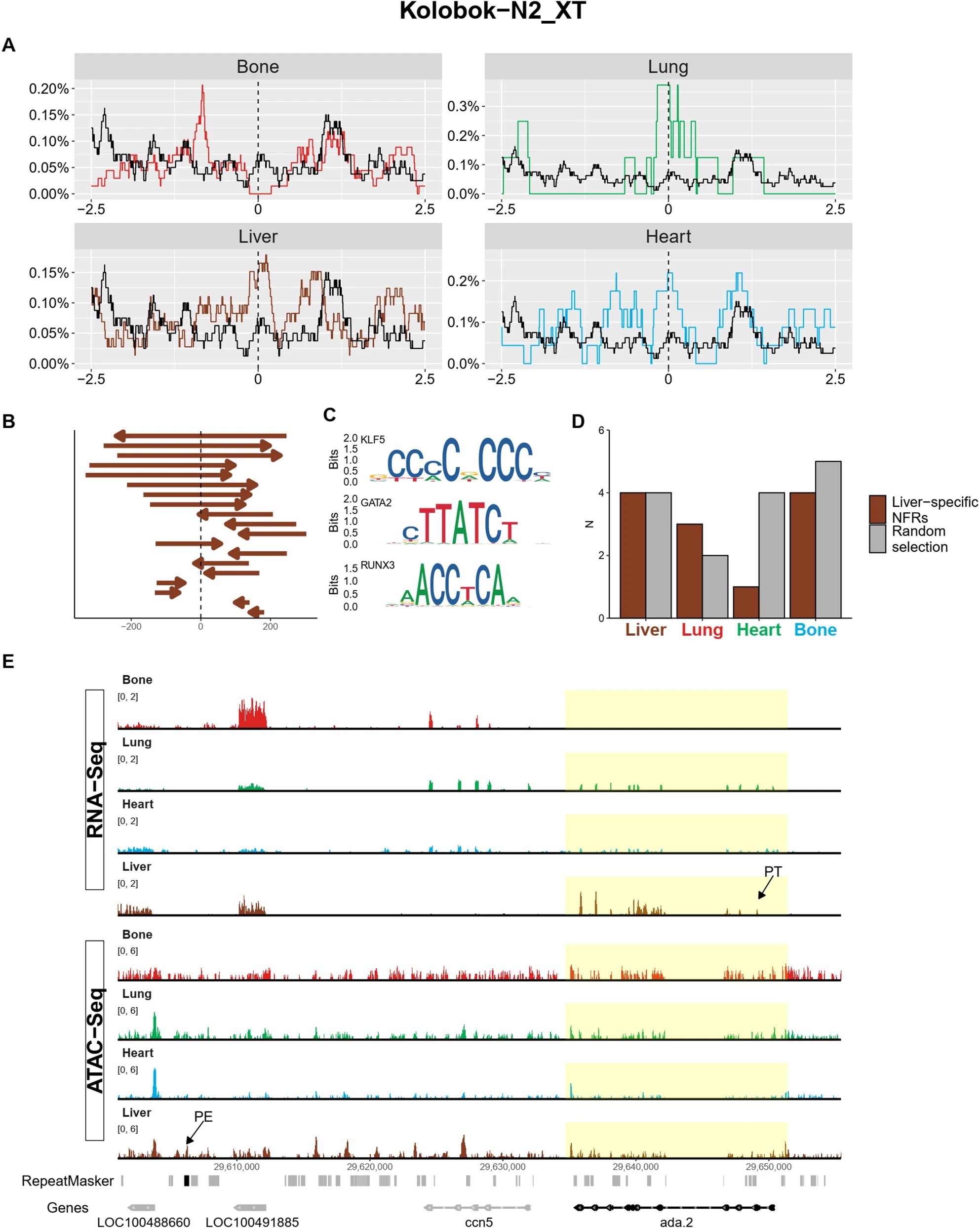 Fig. 4 An analysis of the Kolobok-N2_XT MITE copies located at liver-specific NFRs. A Relative frequency of the Kolobok-N2_XT MITE copies in a 5-kb window centered on the NFR peaks specific to the indicated tissues. Random background is shown in black, while red, green, brown and blue lines respectively correspond to bone, lung, liver, and heart-specific NFRs. B Relative positions of the MITE copies overlapping a 1-kb region centered on the liver-specific NFR. MITEs are shown as arrowheads to indicate their polarity and are sorted according to their size from top to bottom. C Motifs of a selection of TFBSs enriched in the identified Kolobok-N2_XT MITEs. D Comparative analysis of Kolobok-N2_XT MITEs located at liver-specific NFRs (brown), with a random sample of Kolobok-N2_XT MITEs excluded from liver-specific ATAC-Seq peaks (grey). The bar plot shows the number of MITEs located within 200 kb of a gene whose expression is specific to liver, lung, heart and bone, as indicated. A binomial test was applied, and no statistically significant differences were found. E Genomic snapshot of a possible liver-specific regulatory event between a putative enhancer (PE) born from a domesticated Kolobok-N2_XT MITE (black in the repeat masker line) and its putative target gene ada.2 (PT, yellow box). The colour code of the RNA-Seq and ATAC-Seq tracks is as in (A)