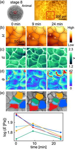 FIGURE 3 (a) Schematic morphology of Xenopus laevis embryo at stage 8 and an optical microscopic image, with AFM measured region indicated by an open square (red). Time-lapse mapping images of H (b), E (c), and θ (d) estimated from (b), where each mapping started at 0 min (left), 9 min (middle), and 24 min (right). Observed cell division is denoted by asterisks in (b). (e) Graph showing stiffness changes of individual cells over time. The colors in the graph correspond to those of the cells shown in AFM images in the upper figure.
