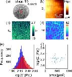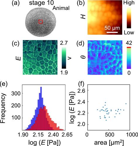 FIGURE 4 (a) Schematic morphology of Xenopus laevis embryo, viewed from the animal pole (Animal) and the vegetal pole (Vegetal) at stage 10. The AFM-measured region is indicated by an open square (red). AFM mapping images of H (b), E (c), and θ (d) estimated from (b). (e) Histograms of E values in the apical cytoplasmic region (blue) and the cell–cell boundary (red), shown in (c). (f) Plots of E values versus cell area (apical cell size) in individual cells, observed in (b) and (c), respectively. The coefficient of determination was 0.036.