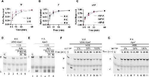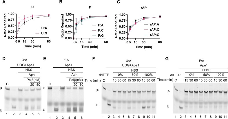 Figure 2. Repair rates, base pairing, and contributions of DNA repair polymerases in the HSS. (A–C) Linear duplex oligonucleotide substrates were incubated with Xenopus HSS for the indicated times, and the repaired products were resolved by denaturing polyacrylamide gel electrophoresis as in Fig. 1, with the fraction repaired was quantified by ImageJ. Each data point resulted from three biological replicates, and the data shown are the mean ± standard deviation (SD). (A), U paired with A or G; (B), F paired with A, C, or G; (C), reduced AP site (rAP) paired with A, C, or G. n = 3 biological replicates, and the data are means ± SD. (D, E) Aphidicolin sensitivity of BER in Xenopus HSS. Where indicated, the HSS was pre-incubated with aphidicolin (100 μg/ml) to inhibit replicative DNA polymerases, with or without added Polβ, incubated with the substrate, and then analyzed for repair as in Fig. 1. (D), U:A substrate, with UDG + Ape1 to cleave unrepaired molecules. (E), F:A substrate, with Ape1 to cleave unrepaired molecules. (F, G) Effect of added ddTTP on the repair reactions. (F) Repair of the U:A substrate; (G), repair of the F:A substrate. C, control; P, repaired product; U, unrepaired substrate or repair intermediate. |