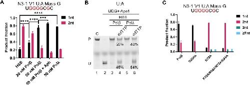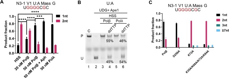 Figure 4. DNA polymerase dictates BER patch size. (A) The BER patch size for a U:A plasmid substrate generated by Xenopus HSS, or HSS supplemented with the indicated proteins and inhibitors. Aph, aphidicolin (100 μg/ml). n = 3 independent experiments and the data are means ± SD. *** indicates P < .001, **** indicates P < .0001. (B) Effect of ddTTP in the presence of added Polβ or Polλ. Incubation time was 60 min. Treatment with UDG and Ape1, followed by electrophoresis on a denaturing polyacrylamide gel, revealed fully repaired (P) and unrepaired (U) molecules. (C) Effect of Polβ polymerase and dRp lyase activities on BER patch size in the Xenopus HSS. |