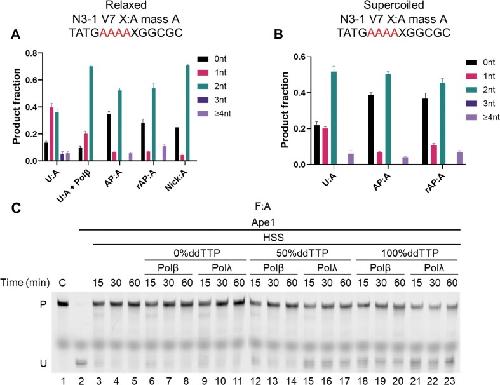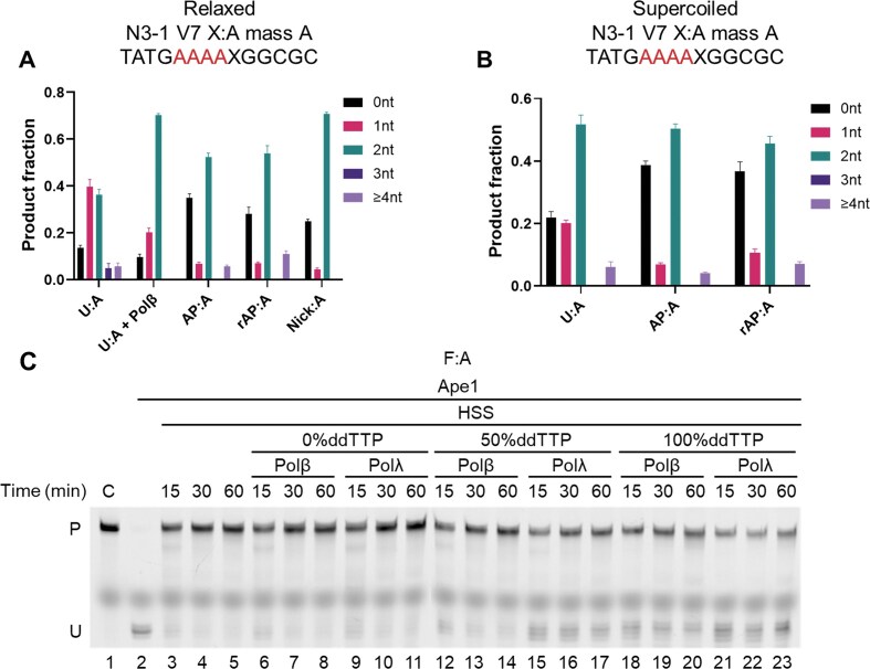 Figure 6. Upstream (5′) excision is a common event in Xenopus HSS BER. 5′ excision gap size of relaxed (A) and supercoiled (B) N3–1 V7 plasmid substrate with the indicated lesions. Polβ final concentration was 50 nM. (C) Dead-end products generated by Polβ and Polλ in the presence of ddTTP. n = 3 independent experiments and the data are means ± SD. The F:A oligonucleotide substrate was incubated with Xenopus HSS supplemented with 50 nM Polβ or Polλ in reaction buffers containing 0%, 50%, or 100% ddTTP (replacing dTTP) for the indicated times. The products were digested with Ape1 and loaded on a denaturing polyacrylamide gel (lanes 6–23). Full-length substrate (lane 1) and digested substrate (lane 2) were included as markers. Lanes 3–5, repair of F:A by Xenopus HSS without any supplementation. |