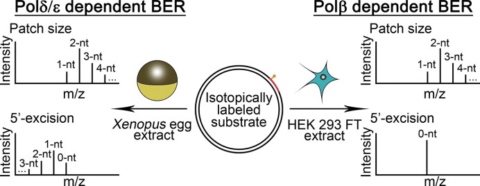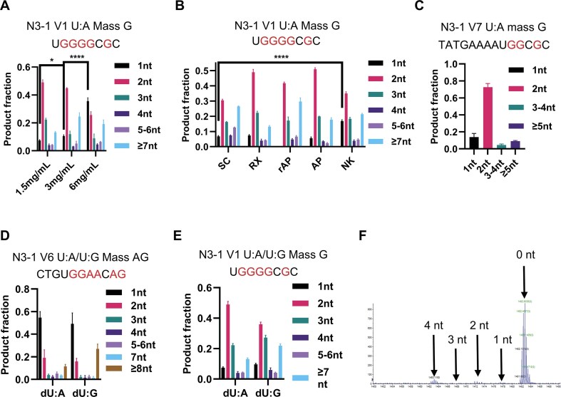 Figure 9. The effect of protein concentration, substrate topological state, and sequence context on BER patch size distribution on HEK 293 WCE. (A) The BER patch size generated by the indicated asynchronous HEK 293 FT WCE concentrations is shown for the N3–1 V1 U:A plasmid substrate. (B) Various lesions in relaxed or supercoiled N3–1 V1 plasmid substrate. (C) The BER patch size generated by asynchronous HEK 293 FT WCE is shown for the N3–1 V7 U:A plasmid substrate (C), N3–1 V6 U:A/U:G plasmid substrate (D) and N3–1 V6 U:A/U:G plasmid substrate. (E) n = 3 independent experiments, and the data are means ± SD. * indicates P < .05. **** indicates P < .0001. (F) A sample mass spectrometry result from asynchronous HEK 293 FT WCE incubated with N3-1 V7 U:A plasmid substrate. 0 nt, 1 nt, 2 nt, 3 nt, and 4 nt indicate the repair products that went through 0 nt, 1 nt, 2 nt, 3 nt, and 4 nt + longer 5′ excision. |