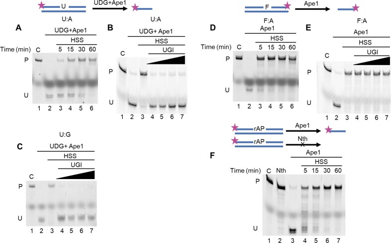 Xenopus HSS has robust BER activity. (A) The U:A substrate was incubated with Xenopus HSS for the indicated times, then digested with UDG + Ape1 to nick the unrepaired portion. Full-length substrate (indicated by C above lane 1), UDG + Ape1 digested substrate (lane 2), and UDG + Ape1 digested, HSS-repaired samples (lanes 3–6) were electrophoresed in a denaturing polyacrylamide gel, then imaged using a fluorescent imager. HSS was pre-incubated with uracil glycosylase inhibitor (UGI) to inhibit endogenous UDG activity before adding the U:A substrate (B) or the U:G substrate. (C) The F:A substrate was incubated with Xenopus HSS for the indicated times, without (D) or with (E) added UGI (0.5, 1, 2, 3 units/μl). Ape1 was added where indicated to cleave unrepaired molecules. (F) The LP-BER substrate rAP was incubated with Xenopus HSS. Nth was used as a control for AP site reduction since Nth cannot digest rAP, while Ape1 can. For all panels, C indicates the starting substrate, P the repaired product, and U the unrepaired substrate or a repair intermediate. F, tetrahydrofuran; rAP, reduced AP site. |